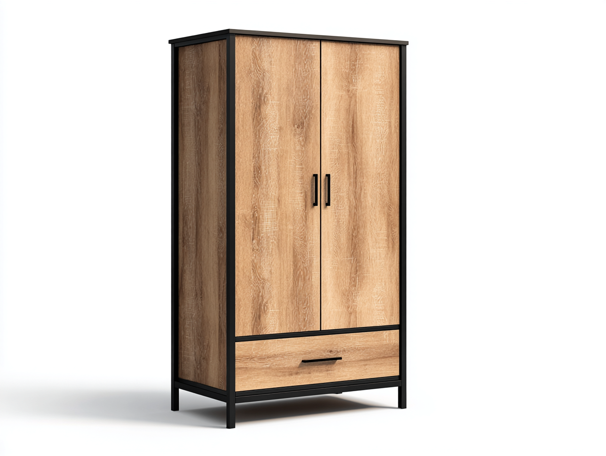 Armoire 2 portes en bois finition chêne et cadre noir 95x55x185 cm - Bois naturel - Style industriel intérieur